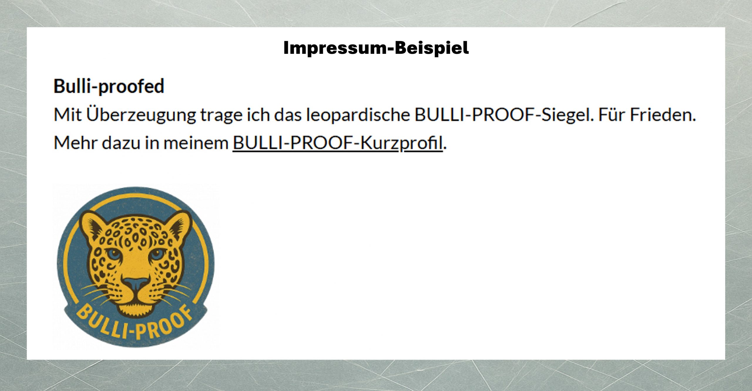 Die folgenden Personen und Organisationen haben den Zertifizierungsprozess gemäß LEO–PROOF–Standard-2026 durchlaufen und führen das leopardische BULLI-PROOF-Siegel. Damit wurde ihr individueller Friedensbeitrag besiegelt. Das jeweilige Kurzprofil gibt Auskunft über die Bulliproofheit des Zertifizierungsgegenstands.